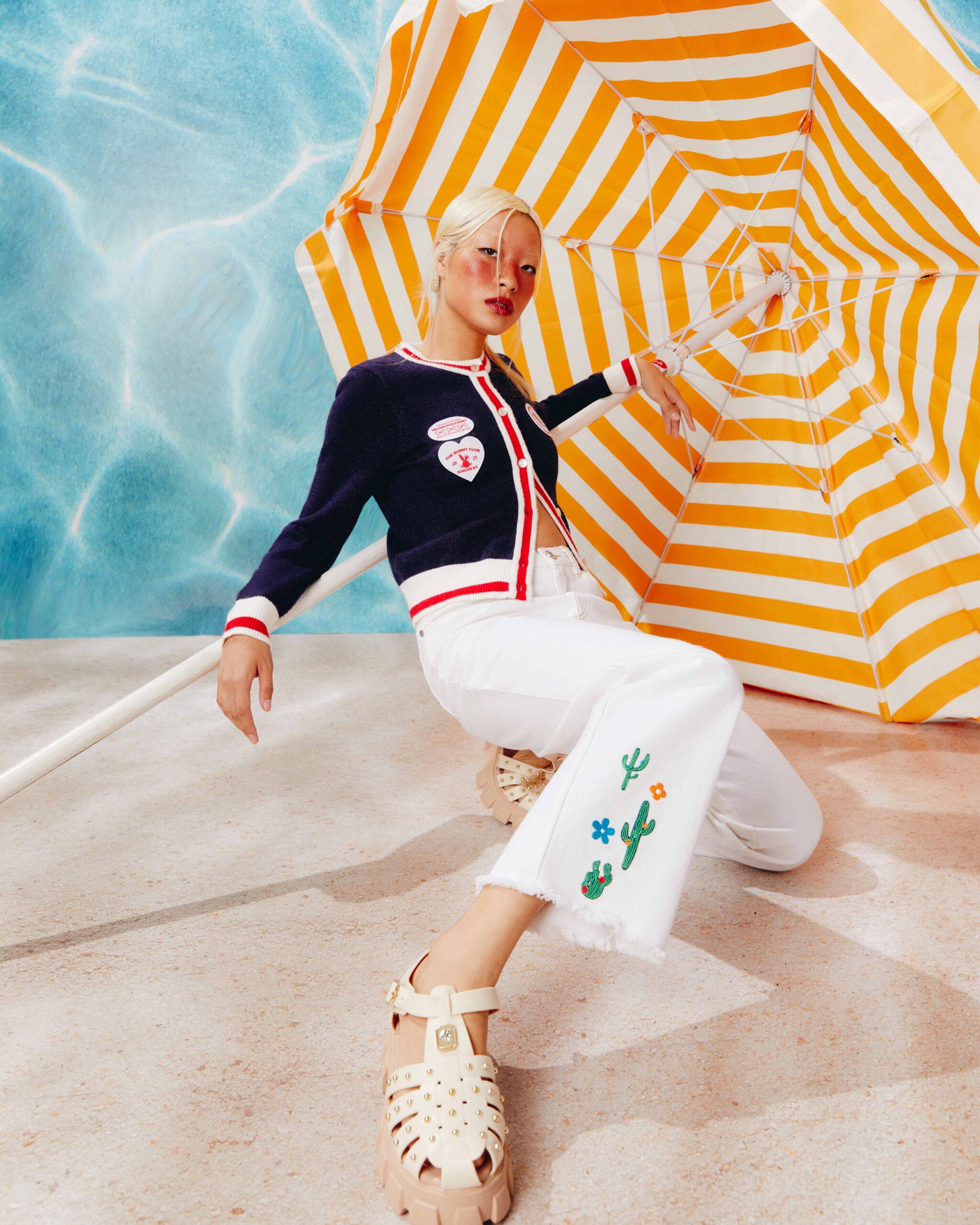 The collection burst with palette: milkshake pink topped with cherry red, sweet jelly-like pastel purple, turquoise green, and deep blue waves, complemented by sandy yellow and white coconut. While stripes reminiscent of sea breezes blend playfully with Jelly Bunny’s character, enhanced by a fruity twist of refreshing strawberry patterns. Designs come alive in a variety of styles, including cropped sweaters, trendy polo-collar sweaters, breezy off-shoulder tops, Hawaiian beach-style shirts, and floral prints with a perfectly effortless daily look. Iconic pieces as cardigans paired with relaxed jeans and knit shorts are must-haves for the season.